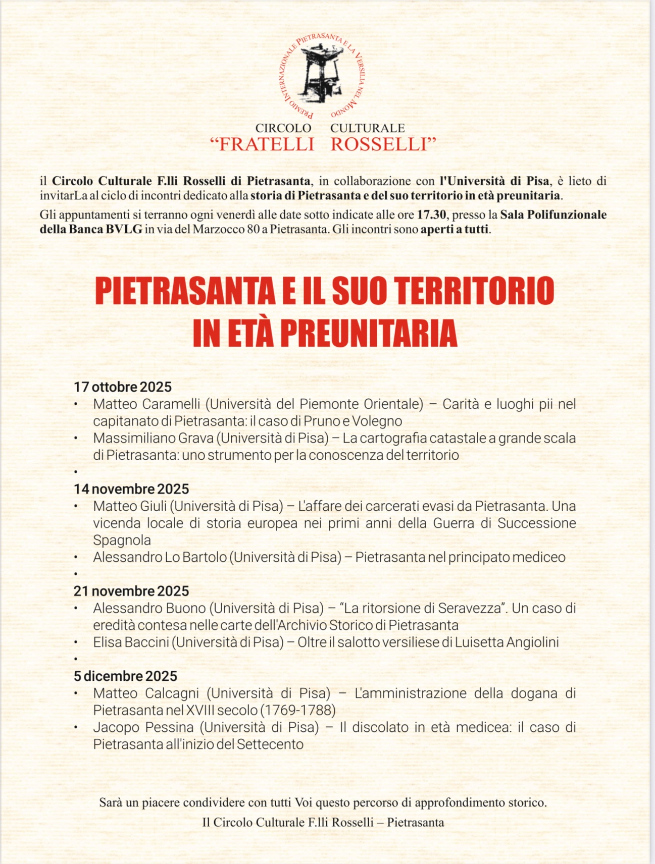 Il Circolo Culturale F.lli Rosselli di Pietrasanta, in collaborazione con l'Universita' di Pisa, e' lieto di invitarLa al ciclo di incontri dedicato alla storia di