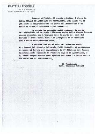 A partire dai primi mesi del prossimo anno, gli Organi del Circolo Culturale F.lli Rosselli si metteranno di nuovo a lavoro per organizzare la 2° Edizione del Premio Internazionale sperando di riuscire meglio di quest’anno, e di avere vicino come sponsor ufficiale la CASSA RURALE ED ARTIGIANA DI PIETRASANTA.